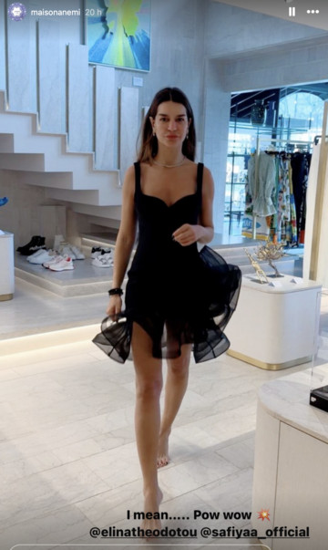 Η ίδια βρέθηκε στην μπουτίκ Maison Anemi, και η καλή της φίλη και ιδιοκτήτρια της μπουτίκ Έμιλυ Γιολίτη, την αποθανάτισε με ένα σέξι, μαύρο μίνι φόρεμα, το οποίο ξεχωρίζει χάρη στο ιδιαίτερο τελειώμα του.