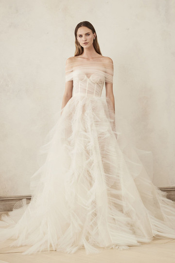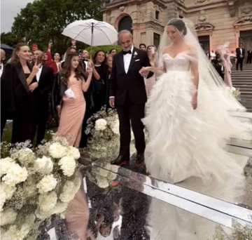 Η νύφη έλαμπε μέσα στο υπέροχο νυφικό που επέλεξε, ένα πριγκιπικό ball gown, με corset στο πάνω μέρος σε off-the shoulder design και layers από τούλι στο κάτω μέρος.