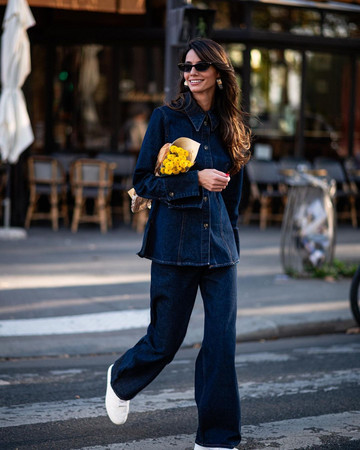 Μονόχρωμο look σε στιλ κοστούμι με straight παντελόνι και blazer