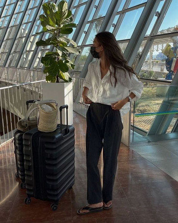Ένα λινό άσπρο πουκάμισο και ένα wide leg παντελόνι με flip flops είναι μια κομψή επιλογή, για εσένα που θέλεις να είσαι στιλάτη και στο αεροδρόμιο.