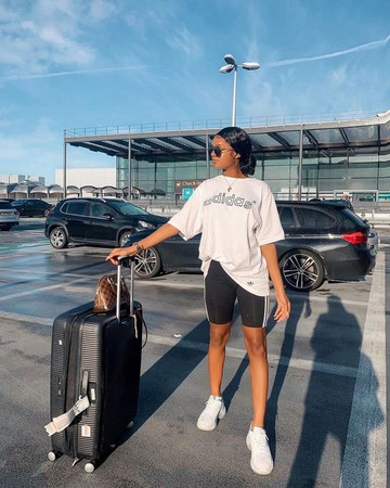 Διάλεξε ένα oversized T-shirt με άνετα biker shorts και λευκά trainers, για εσένα που θέλεις να είσαι άνετη στο αεροπλάνο.