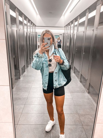 Πόνταρε σε ένα look με λευκό crop top με biker shorts και jean jacket. Έτσι, σε περίπτωση που κρυώσεις μέσα στο αεροπλάνο θα μπορείς να φορέσεις το jacket σου.