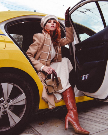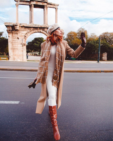 Η Έβελυν λοιπόν επέλεξε ένα υπέροχο λευκό πλεκτό φόρεμα, το οποίο συνδύασε με ένα ζευγάρι καφέ μπότες και καμηλό παλτό. Ολοκλήρωσε το σύνολο της με ένα checked κασκόλ καφέ γάντια και ένα off-white γούνινο μπερέ.