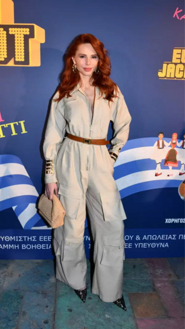 Η καφέ ζώνη στη μέση ήταν η πινελιά που ξεχωρίσαμε, ενώ το μάτι μας πήγε κατευθείαν στα animal print mules που επέλεξε η Έβελυν. Το σύνολο ολοκληρώθηκε με δύο χρυσά βραχιόλια πάνω από τα μανίκια της ολόσωμης φόρμας (ένα στο κάθε χέρι), σκουλαρίκια στο ίδιο χρώμα και μια ψάθενη τσάντα που η Έβελυν κρατούσε με «χάρη» και στιλ!