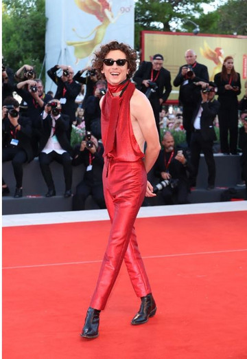 O Timothée Chalamet με κόκκινη ολόσωμη φόρμα Haider Ackermann.