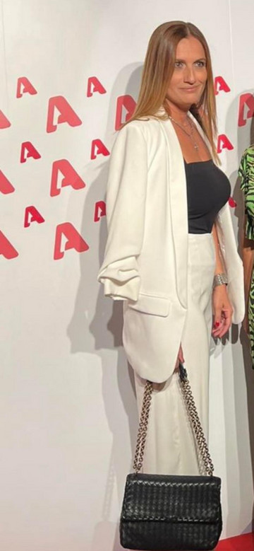 Η Γωγώ Αλεξανδρινού, κατάφερε να δημιουργήσει ένα αβίαστα κομψό look επιλέγοντας ένα κοστούμι από τα καταστήματα Zara. Το look της ολοκλήρωνε, ένα μαύρο απλό top μέσα από το blazer και μια τσάντα Bottega Veneta.