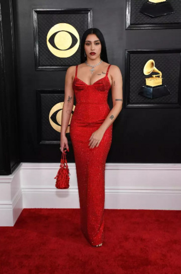 H Lourdes Leon με sexy κόκκινο μάξι φόρεμα Area και ασορτί τσαντάκι.