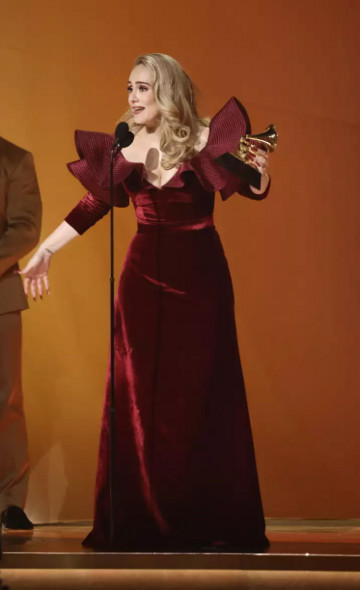 H Adele με custom maxi βελούδο φόρεμα του οίκου Louis Vuitton σε μπορντό χρώμα.