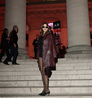 Η εμφάνιση της στο Παρίσι όντως συγκεντρώνει όλα τα στοιχεία που χαρακτηρίζουν τα πιο hot fashion trends της σεζόν. Το see-through κορμάκι με τις διακριτικές λεπτομέρειες στο μπούστο σε συνδιασμό με μαύρο σορτς δίνουν μια αισθησιακή αλλά και δυναμική βάση, ενώ το δερμάτινο παλτό σε κεράσι τόνους αναδεικνύει το χρώμα-κλειδί του Φθινοπώρου.