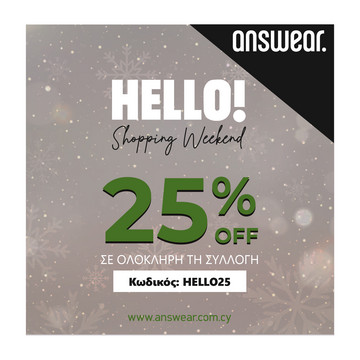 Το HELLO! Cyprus συνεργάζεται για δεύτερη φορά με το οnline κατάστημα Answear αλλά αυτή τη φορά αντί 20% σου προσφέρει 25% σε ολόκληρη τη συλλογή του. Μάλιστα αυτό το Shopping Weekend θα έχει μεγαλύτερη διαρκεία λόγω Χριστουγέννων. Η έκπτωση θα είναι σε ισχύ για τρεις ημέρες, από τις 22 Δεκεμβρίου μέχρι τις 24 Δεκεμβρίου.