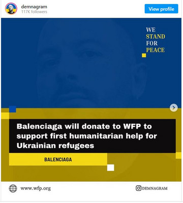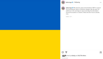 Παράλληλα, Demna Gvasalia, καλλιτεχνικός διευθυντής του οίκου μοιράστηκε μια και μοναδική φωτογραφία στα χρώματα της σημαίας της Ουκρανίας για να δηλώσει την υποστήριξή του στη χώρα ενώ παράλληλα παρακάλεσε τους θαυμαστές του οίκου να συμμετέχουν κι εκείνοι, κάνοντας δωρεές που μπορούν να βοηθήσουν την χώρα. «Είμαστε υπέρ της ειρήνης και υποστηρίζουμε την πρώτη ανθρωπιστική βοήθεια του WFP για Ουκρανούς πρόσφυγες. Τις επόμενες ημέρες ανοίγουμε τις πλατφόρμες μας για να αναφέρουμε και να μοιραστούμε πληροφορίες σχετικά με την κατάσταση στην Ουκρανία».
