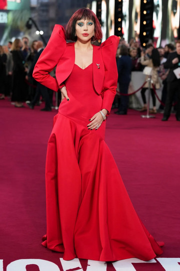Στην πρεμιέρα, η Lady Gaga μαγνήτισε τα βλέμματα, δίνοντας την αίσθηση ότι η Harley Quinn κατέβηκε από την οθόνη για να περπατήσει στο κόκκινο χαλί. Το εκπληκτικό σύνολο που φόρεσε ήταν μία δημιουργία του οίκου Celine, ειδικά σχεδιασμένο για εκείνη. Το εντυπωσιακό κόκκινο φόρεμα με στενή γραμμή και βαθύ ντεκολτέ, που κατέληγε σε ασύμμετρο τελείωμα με όγκο, συμπληρώθηκε από ένα cropped μπολερό σακάκι με μεγάλα puffy μανίκια, προσδίδοντας έναν extravagant και αριστοκρατικό αέρα.