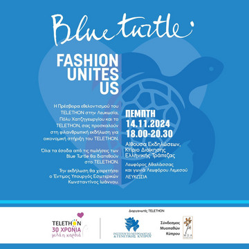 Σε μια ξεχωριστή εκδήλωση, που συνδυάζει τη μόδα με την κοινωνική προσφορά, η Πρέσβειρα Εθελοντισμού του TELETHON στη Λευκωσία, κυρία Πόλυ Χατζηγεωργίου, θα παρουσιάσει τη νέα συλλογή του brand της, «Blue Turtle», σε μια ξεχωριστή εκδήλωση η οποία θα έχει στόχο την οικονομική ενίσχυση του φιλανθρωπικού θεσμού. Η εκδήλωση, με σλόγκαν «Fashion Unites Us», θα πραγματοποιηθεί την Πέμπτη, 14 Νοεμβρίου 2024, από τις 18:00-20:30, στην αίθουσα εκδηλώσεων του κτιρίου Διοίκησης της Ελληνικής Τράπεζας στη Λευκωσία.