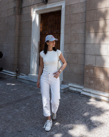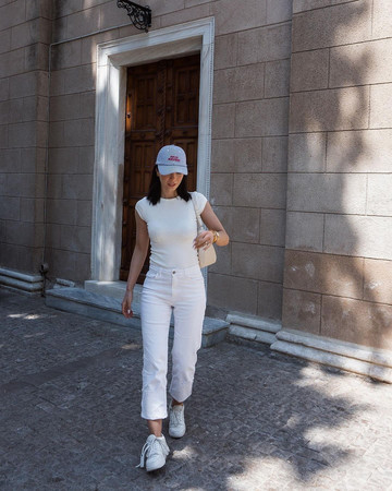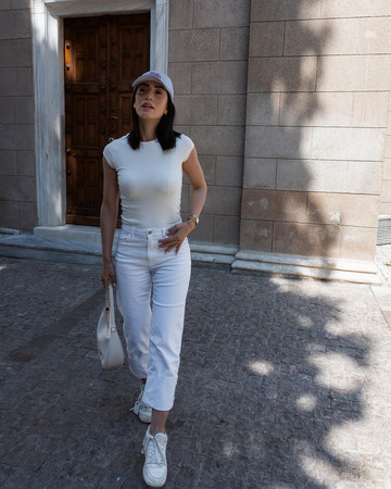 Η εμφάνιση της Νάσιας, είναι ακριβώς αυτό που «ψάχνεις» για το Πάσχα! Ένα στενό άσπρο τζιν με ασορτί τοπ από πάνω. Δύο casual, ευκολό-συνδύαστα κομμάτια που μπορείς να τα προσαρμόσεις στο δικό σου γούστο και στυλ. Για παράδειγμα, μπορείς να επιλέξεις ένα λευκό τζιν σε άλλη γραμμή, όπως “boyfriend’’, ή ένα oversized.