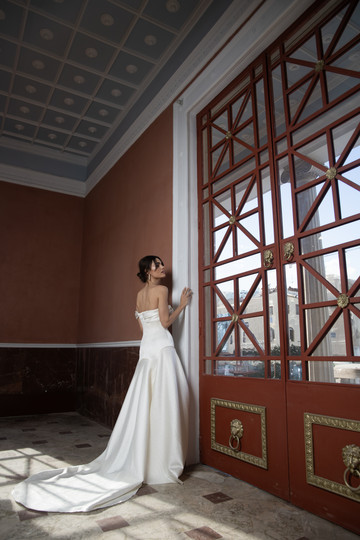 Οι νυφικές δημιουργίες με ντραπέ ή σιφόν λεπτομέρειες κολακεύουν και αναδεικνύουν την σιλουέτα, ενώ τα σχέδια με ανοιχτή πλάτη αποτελούν μια διαχρονική αξία, την οποία η Έλενα Στρογγυλιώτου επαναπροσδιορίζει με φίνα υφάσματα και περίτεχνα σχέδια.