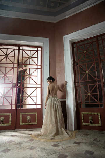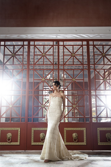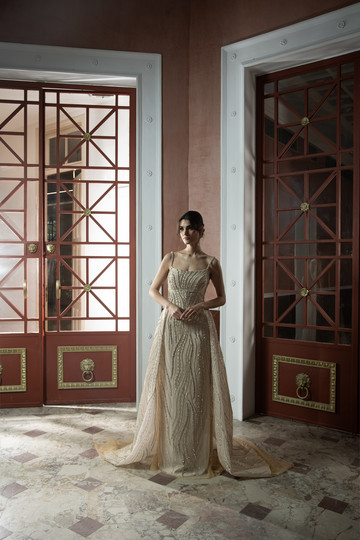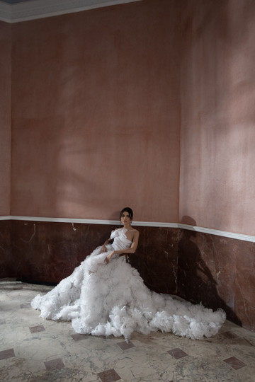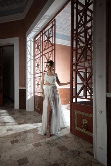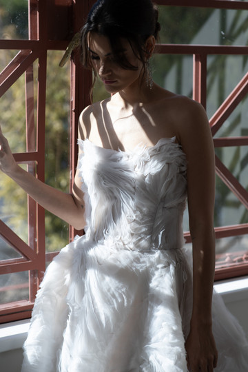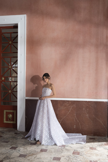 Μεταξωτή οργάντζα, μουσελίνα, ταφτάς με ανάγλυφες υφάνσεις, δαντέλα guipure και mesh lace με ιδιαίτερες υφές αλλά και κεντημένα υφάσματα με χάντρες ή κρύσταλλα Swarovski, με τη δημιουργική ματιά της Έλενας Στρογυλλιώτου και τη μοναδική τεχνική της, εξελίσσονται σε ρευστά έργα τέχνης που αποκαλύπτονται σε κάθε κίνηση.