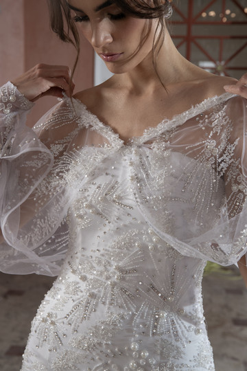 Η Έλενα Στρογγυλιώτου απογειώνει την τάση του στράπλες νυφικού προσθέτοντας στις δημιουργίες της αποσπώμενα κομμάτια. Μανίκια, φουλάρια στο λαιμό και off the sloulder λεπτομέρειες που στη συνέχεια μπορούν να αφαιρεθούν δημιουργώντας στην ουσία δυο νυφικές εμφανίσεις.