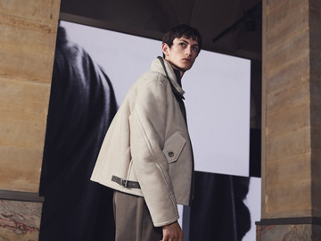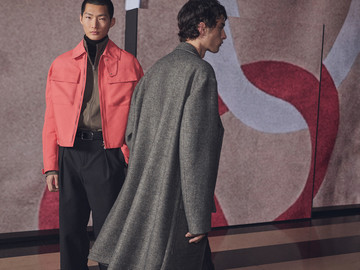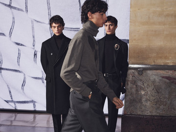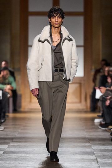 Από εκεί και πέρα, η επίδειξη εξελίχθηκε σε ένα masterclass υλικών και αναλογιών: καμπαρντίνες που μετατράπηκαν σε αντικείμενα πόθου, πλεκτά με καρό μοτίβα και γιακά με φερμουάρ, κοστούμια με ρίγα κομμένα στην εντέλεια. Παλτό από αδιάβροχο διπλό κασμίρ, jacket από full-grain δέρμα, παλτό από κασμίρ και μαλλί, pea jacket με επένδυση από shearling.