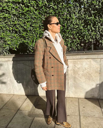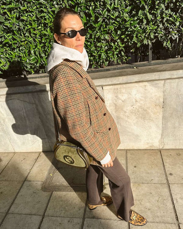 Σε μια από τις πρωινές της εμφανίσεις, η Βίκυ Καγιά κατάφερε να δημιουργήσει ένα από τα πιο εντυπωσιακά casual looks. Συνδύασε ένα καρό oversized σακάκι με animal print loafers – ένα συνδυασμό που στην αρχή ακούγεται ακατόρθωτο, αλλά στην πράξη είναι το απόλυτο trend! Αντί για το συνηθισμένο τζιν και hoodie, φόρεσε αυτό το statement σακάκι και άφησε τα παπούτσια της να κλέψουν την παράσταση με το λεοπάρ μοτίβο τους. Ολοκλήρωσε την εμφάνισή της με μια χακί σουέτ shoulder bag, η οποία πρόσθεσε την τελευταία πινελιά σε ένα εκρηκτικό σύνολο.