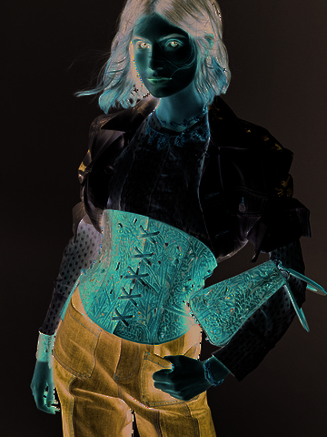 Tie-dye τζάκετ από ντένιμ, μπλούζα από δαντέλα, δερμάτινος κορσές, τζην παντελόνι, κολιέ “D-Cameo” και “Mille Fleurs”, χρυσό βραχιόλι, δερμάτινο φαρδύ βραχιόλι και δερμάτινη τσάντα με ανάγλυφα σχέδια, όλα Dior, Dior Boutique.