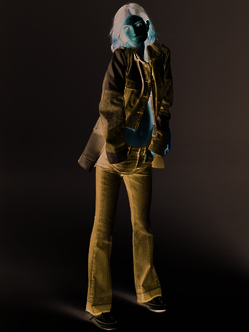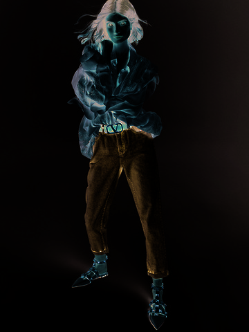 Τζην ολόσωμη φόρμα, Temperley London. Μπλούζα και ψηλές δερμάτινες μπότες, όλα Zara. Χρυσό μενταγιόν με διαμάντια, Cartier. Δερμάτινη ζώνη, Etro. Τie-dye τσαντάκι, Dior, Dior Boutique.