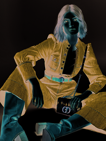 Σύνολο από ντένιμ με τυπωμένα logos, sling bag γόβες, τσάντα “Jackie 1961” από δέρμα και σουέντ, όλα Gucci. Δαχτυλίδι από λευκό χρυσό με πολύχρωμες πέτρες, Roberto Coin.