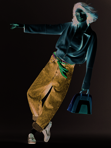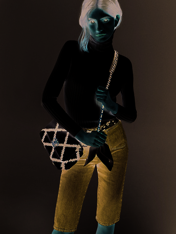 Παρκά με εφέ patchwork, Stella McCartney. Γιλέκο και τζην παντελόνι, και τα δύο Guess. Δερμάτινο τσαντάκι, Hermès, Hermès Store Athens.