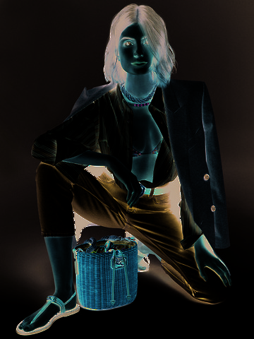 Λινό σακάκι, Zara. Ριγέ πουκάμισο, σουτιέν από μπικίνι, χρυσό κολιέ, τσόκερ με πολύχρωμες πέτρες, δερμάτινη ζώνη και τσάντα-καλάθι, όλα Etro. Τζην παντελόνι, Mango. Σανδάλια, Celine by Hedi Slimane.