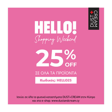 To HELLO! Cyprus διοργανώνει ακόμη ένα Shopping Weekend, με το beauty brand DUST+CREAM στις 8 & 9 Ιουνίου. Η έκπτωση ισχύει τόσο στο e-shop https://www.dustandcream.cy όσο και στα φυσικά καταστήματα DUST+CREAM.