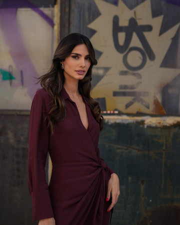 Βουργουνδί wrap dress με χρυσά σκουλαρίκια.