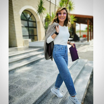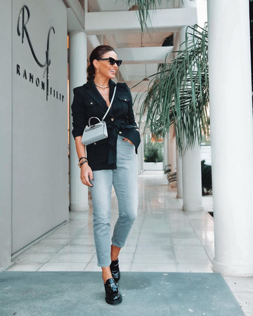 - H all time stylish Ramona Filip έκανε τον απόλυτο συνδυασμό με το high waist cigarette jean από Marks and Spencer, με μαύρο blazer και μαύρα πέδιλα. Σε ένα δεύτερο συνδιασμό φόρεσε το high waist cigarette jean με μαύρo flat mocassini προσδίδοντας μεγαλύτερη άνεση στο look της. Δημιούργησε ένα look που φοριέται από το πρωί μέχρι το βράδυ με την ίδια ευκολία.