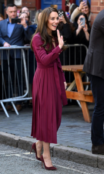 Η πριγκίπισσα Κέιτ ξεχώρισε από το πλήθος με ένα υπέροχο μονόχρωμο look. Συγκεκριμένα, φόρεσε ένα trench φόρεμα, μάρκας Karen Millen σε μπορντώ απόχρωση, το οποίο συνδύασε με γόβες στιλέτο στην ίδια απόχρωση.