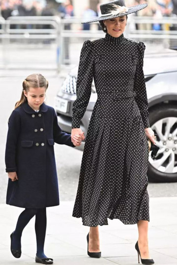 Η Kate, επέλεξε να φορέσει ένα πουά φόρεμα σε midi γραμμή και φουσκωμένους ώμους που έφερε την υπογραφή της Alessandra Rich. Απογείωσε την εμφάνιση της με ένα καπέλο και κλασικές γόβες.