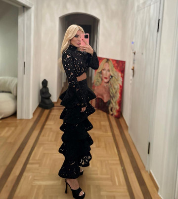 Συγκεκριμένα, την είδαμε να φοράει ένα μαύρο δαντελένιο co-ord set με βολάν στη φούστα ενώ το top της είχε ζιβάγκο, δίνοντας μια πιο φθινοπωρινή πινελιά στο όλο look της. Το σύνολό της ήταν δημιουργία της Κύπριας σχεδιάστριας, Έφης Παπαϊωάννου.