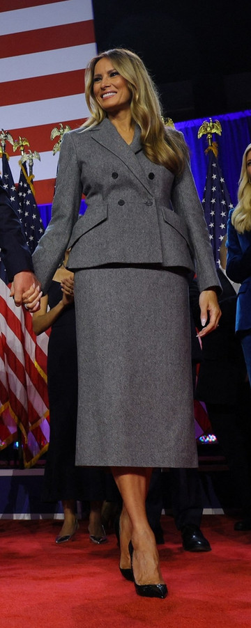 Η Melania Trump, που θα επιστρέψει στον Λευκό Οίκο μετά από τέσσερα χρόνια, επέλεξε για την περίσταση ένα κομψό γκρι μάλλινο ταγέρ, με σακάκι που εφαρμόζει στη μέση και μίντι φούστα. Το ντύσιμό της συνδυάστηκε με μαύρες λουστρίνι γόβες, ενισχύοντας ακόμη περισσότερο τη σοφιστικέ αισθητική του look.