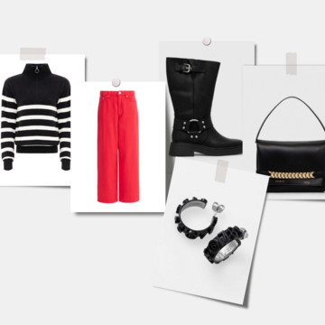 Urban Rebel: Ένα σύνολο που αποπνέει δυναμισμό και αστική κομψότητα, συνδυάζοντας τολμηρά χρώματα και υφές. Το μαύρο και λευκό ριγέ πουλόβερ δημιουργεί ένα μοντέρνο και χαλαρό vibe, ενώ το κόκκινο φαρδύ παντελόνι προσθέτει ένταση και στιλιστική τόλμη. Τα μαύρα biker boots με μεταλλικές λεπτομέρειες φέρνουν στο προσκήνιο μια ροκ διάθεση, ιδανική για τολμηρές, καθημερινές εμφανίσεις. Η μαύρη τσάντα με την κομψή αλυσίδα ισορροπεί το σύνολο, δίνοντάς του μια πινελιά πολυτέλειας. Τα μαύρα σκουλαρίκια προσθέτουν την απαραίτητη λεπτομέρεια, ολοκληρώνοντας το look με έναν ιδιαίτερο τρόπο.