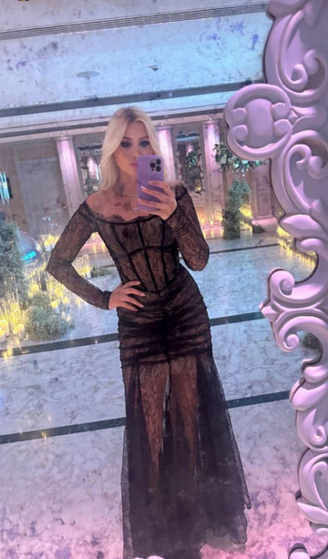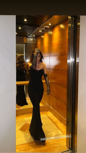 Η Στέλλα Ζαβρού, με ένα μαύρο mermaid dress και ψηλά see through γάντια στο ίδιο χρώμα
