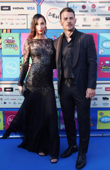 Η Δήμητρα Βαμβακούση με maxi lace sequinned φόρεμα δίπλα στον σύντροφό της, Γιώργο Αγγελόπουλο.