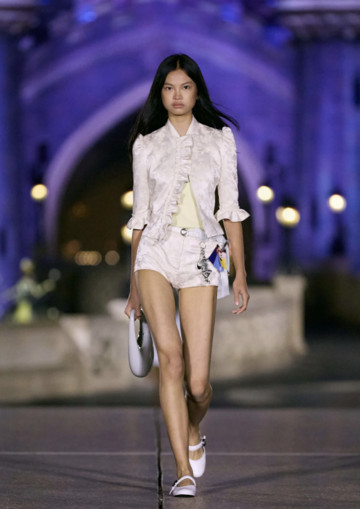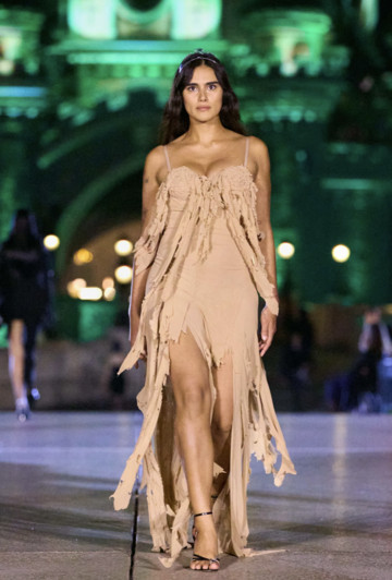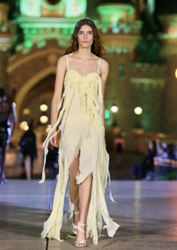 Όσον αφορά τη νέα συλλογή, είναι η μεγαλύτερη που έχει κάνει ποτέ ο οίκος Coperni. Το σόου ξεκίνησε με τις πιο “γλυκές” δημιουργίες του οίκου. Με τζάκετ από λευκό ανθισμένο ζακάρ με κρόσια που φορέθηκαν πάνω από παντελόνια, τα οποία παρέπεμπαν στον 20ό αιώνα και στη γέννηση του Walt Disney. Πεταλούδες από οργάντζα αιωρούνταν πάνω σε cami φορέματα, σηματοδοτώντας μια μεταμόρφωση από την παιδική αθωότητα σε μια πιο κουρασμένη πραγματικότητα.