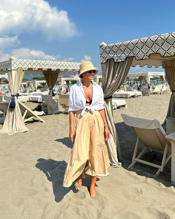 Όσο για το δεύτερο look της, κινήθηκε σε πιο ανοιχτόχρωμες αποχρώσεις καθώς φόρεσε ένα λευκό πουκάμισο που έδενε μπροστά στο στήθος και από μέσα, διακρινόταν το μαύρο μαγιό της. Η μπεζ midi φούστα της σε A-line γραμμή έδωσε μια πιο αέρινη νότα στο όλο look της και ολοκλήρωσε την εμφάνισή της με τα ίδια αξεσουάρ, όπως και στο πρώτο outfit της.