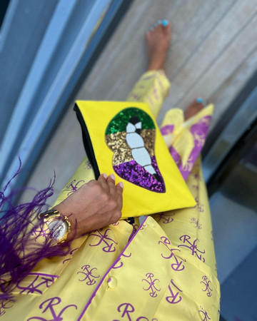 Η γνωστή σχεδιάστρια μόδας, λοιπόν δημιούργησε ένα comfy pyjama-look επιλέγοντας ένα co-ord σετ σε κίτρινη απόχρωση, με all-over logoed print και ολοκλήρωσε το σύνολο της με ένα πολύχρωμο παιχνιδιάρικο pochette.