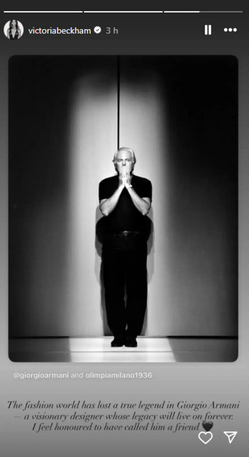 Μέσα από ένα Instagram story, η Βικτόρια Μπέκαμ τόνισε πως ο κόσμος της μόδας έχασε έναν αληθινό θρύλο. «Ο κόσμος της μόδας έχασε έναν αληθινό θρύλο με τον Τζόρτζιο Αρμάνι — έναν οραματιστή σχεδιαστή του οποίου η κληρονομιά θα ζει για πάντα. Νιώθω τιμή που τον αποκαλούσα φίλο», έγραψε.