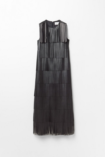 Μακρύ φόρεμα με κρόσσια. Στρογγυλή λαιμόκοψη και αμάνικο σχέδιο. Κλείσιμο με κρυφό φερμουάρ στην πλάτη.