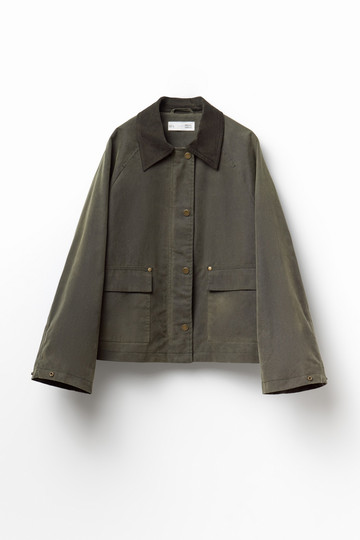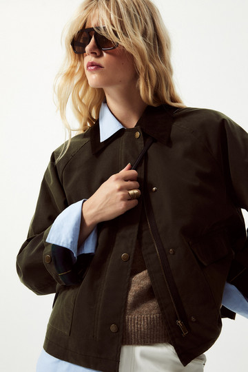 Κοντό μπουφάν με γιακά σε αντίθεση και εξωτερικές τσέπες. Κλείσιμο με φερμουάρ και εσωτερική καρό φόδρα.