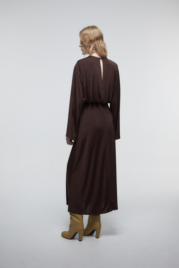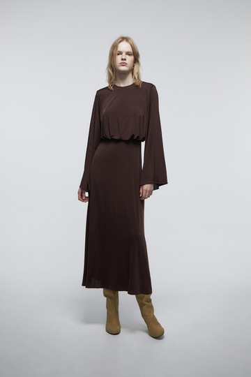 Μακρύ φόρεμα με στρογγυλή λαιμόκοψη, μανίκια σε γραμμή καμπάνας και άνοιγμα στην πλάτη με κούμπωμα κουμπιού.