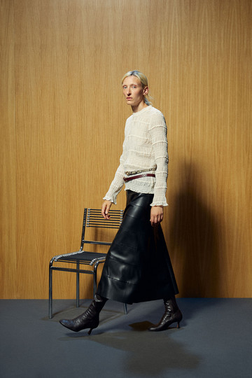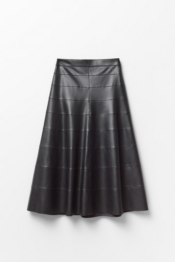 Μακριά φούστα σε όψη δέρματος με λεπτομέρεια κοψιμάτων. Κλείσιμο με φερμουάρ στο πίσω μέρος.