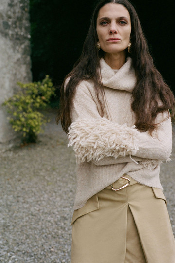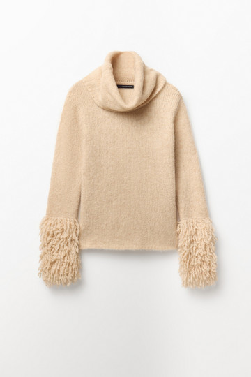 Πουλόβερ με χαλαρό ζιβάγκο και μακριά μανίκια με λεπτομέρεια από κρόσσια.