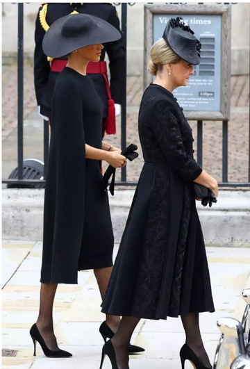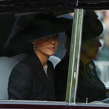 Όσον αφορά τα κοσμήματα, επιτρέπονται οι πέρλες διότι θεωρείται ότι συμβολίζουν το πένθος. Ακολουθώντας λοιπόν τους ενδυματολογικούς κανόνες, η Kate μπήκε στο Αββαείο κρατώντας από το χέρι την μικρή Charlotte. Η πριγκίπισσα της Ουαλίας φορούσε ένα μαύρο coat dress, καπέλο με βέλο και το pearl choker κολιέ που άνηκε στην πριγκίπισσα Diana.
