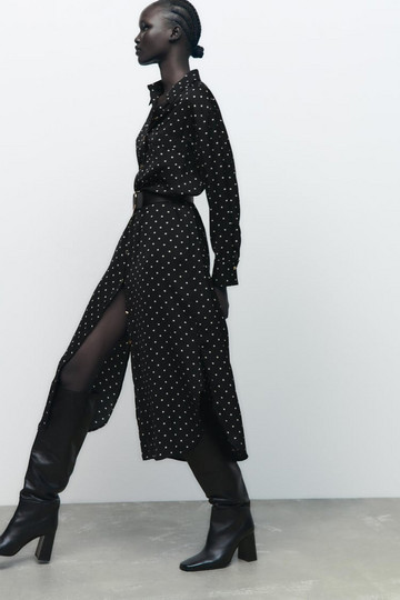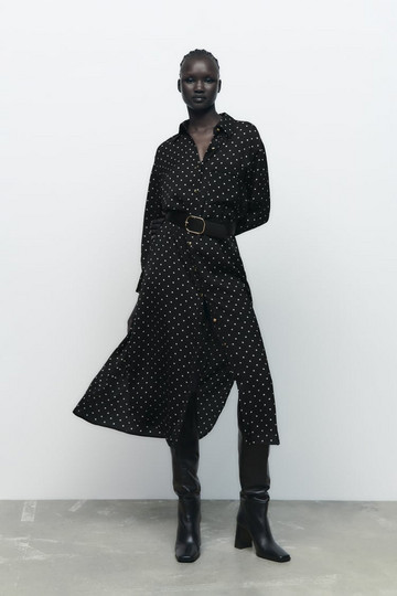 Γι’ αυτό και εμείς σου βρήκαμε το ιδανικό φόρεμα για την επιστροφή στο γραφείο μετά τις γιορτές. Ένα midi φόρεμα σε πουά print, το οποίο ξεχωρίζει χάρη στην ζώνη που διαθέτει στην μέση και τα χρυσά κουμπάκια στο μπροστινό μέρος. Προκείται για ένα αρκετά οικονομικό κομμάτι αφού το κόστος του ανέρχεται μόλις στα 49.95 ευρώ.