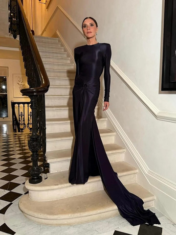 Το φόρεμα της Βικτόριας ανήκει στη νέα capsule συλλογή της. Το φόρεμα, σε πλούσια απόχρωση blackberry, είναι το ‘Circle Detail Gown’. Διαθέτει φουλ μάξι γραμμή, μακριά μανίκια, λεπτομέρειες με ruched λεπτομέρεις στους γοφούς και statement ώμους.
